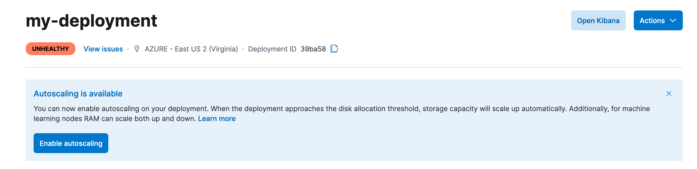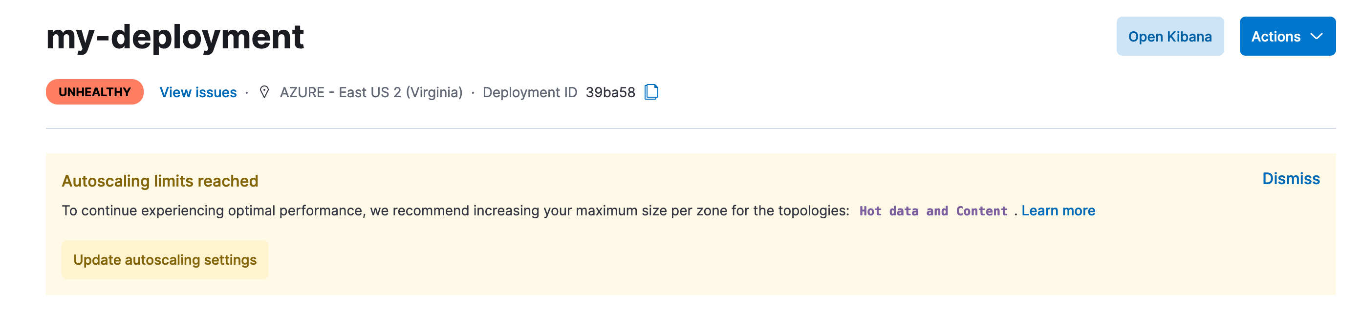 healthystatus. If the cluster is still out of disk, check if autoscaling has reached its limits. You will be notified about this by the following banner:
