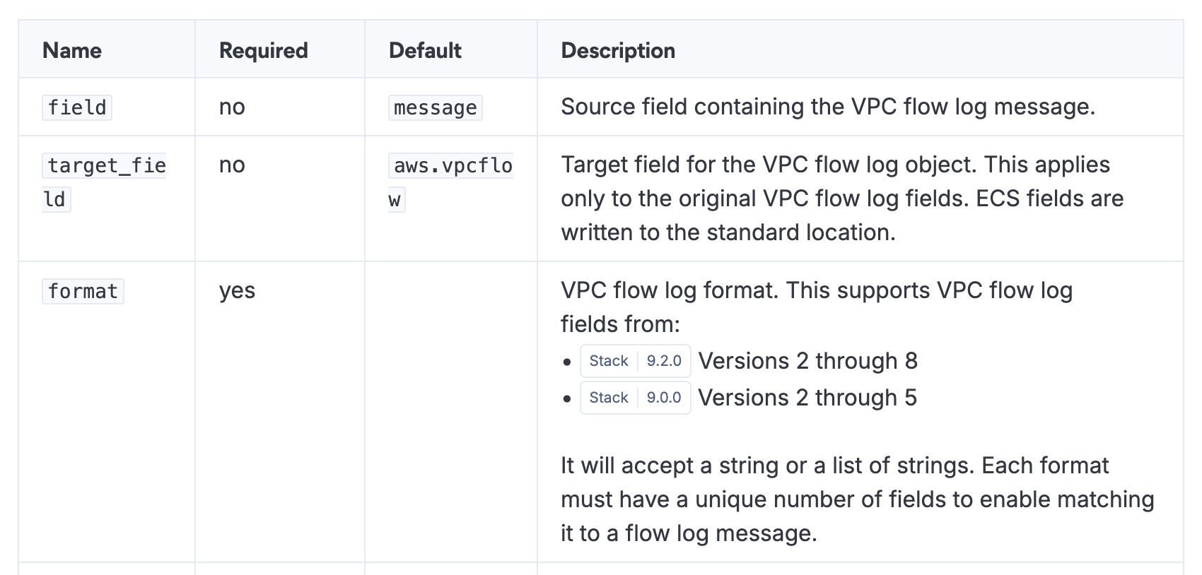 For example, the Parse AWS VPC Flow Log page includes new information relevant to 9.2.0 and later about a setting that already existed before 9.2.0. In this example, the applies_to badges should be at the beginning of each list item as described in the guidelines for lists.
