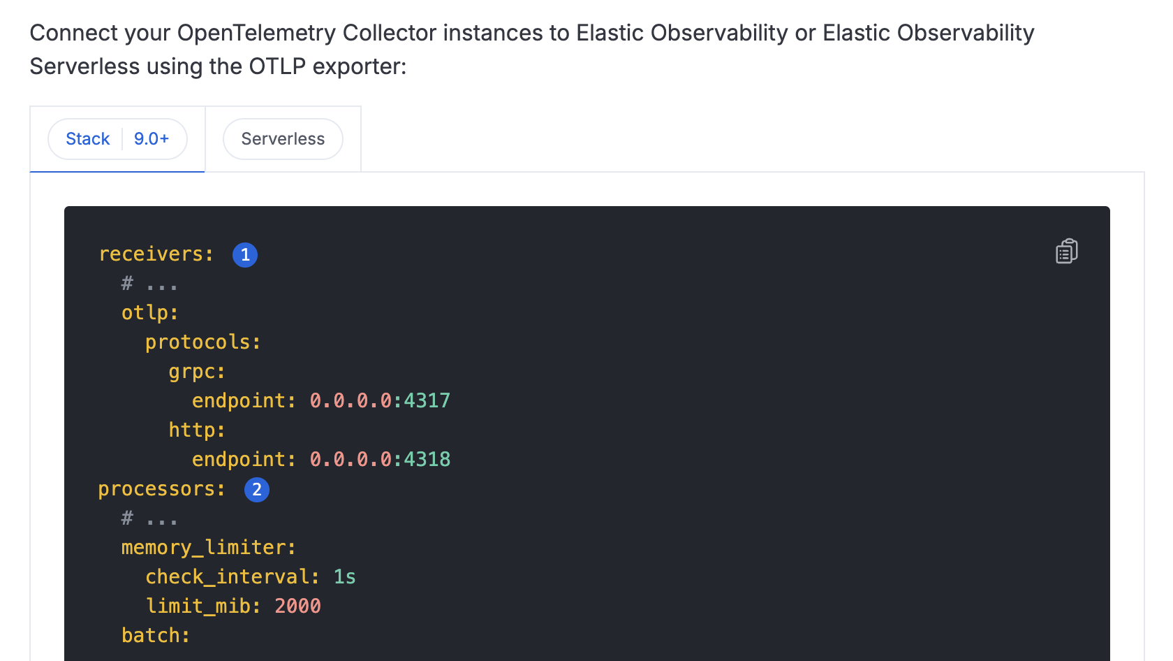 Example: On the Upstream OpenTelemetry Collectors and language SDKs page, we use tabs to show two different code blocks: one for Serverless and one for Elastic Stack (stateful).