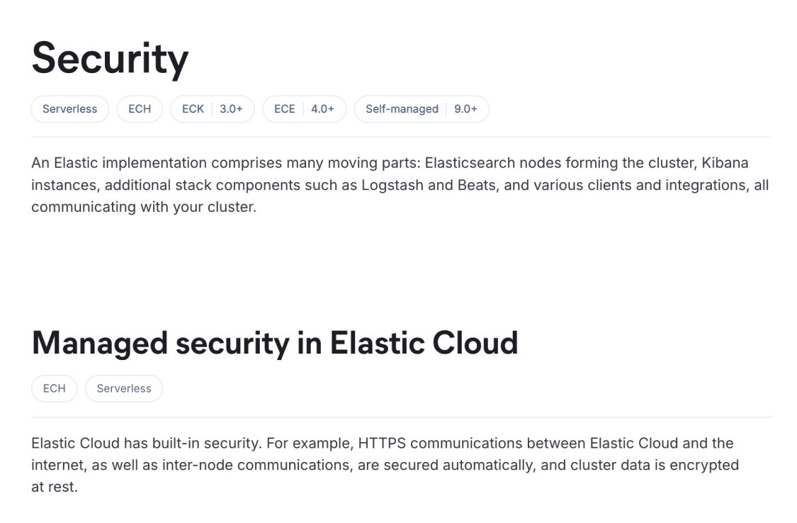 For example, the content on the Security page is generally applicable to all deployment types, but the first section only applies to Elastic Cloud Hosted and Serverless: