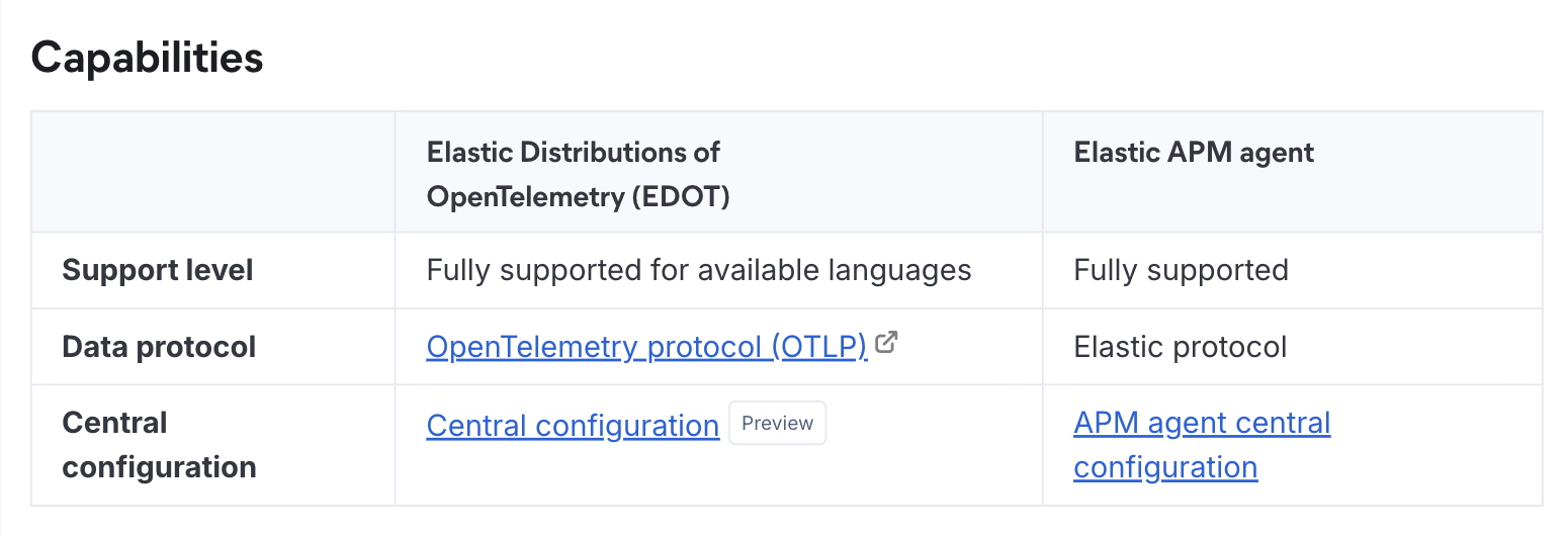 For example, the Collect application data page includes a table that compares functionality across two methods for collecting APM data, and only one of the methods is in technical preview.