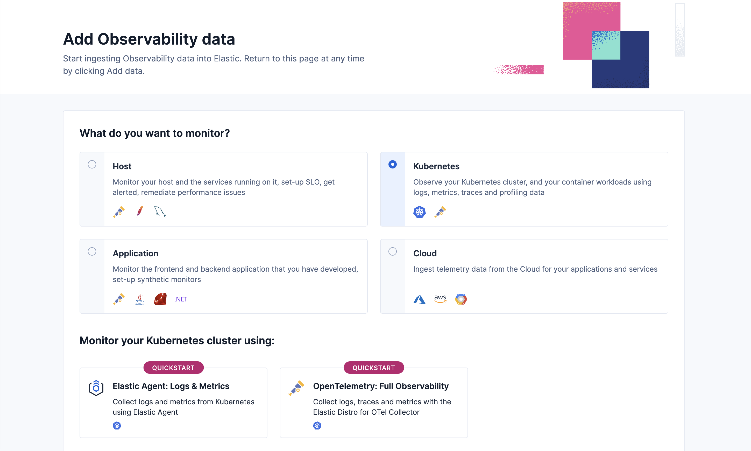 3. Under What do you want to monitor? select Kubernetes, and then select OpenTelemetry: Full Observability.