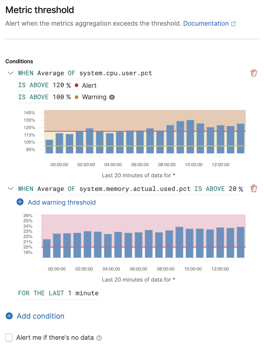 In this example, the conditions state that you will receive a critical alert for hosts with a CPU usage of 120% or above and a warning alert if CPU usage is 100% or above. Note that you will receive an alert only if memory usage is 20% or above, as per the second condition.