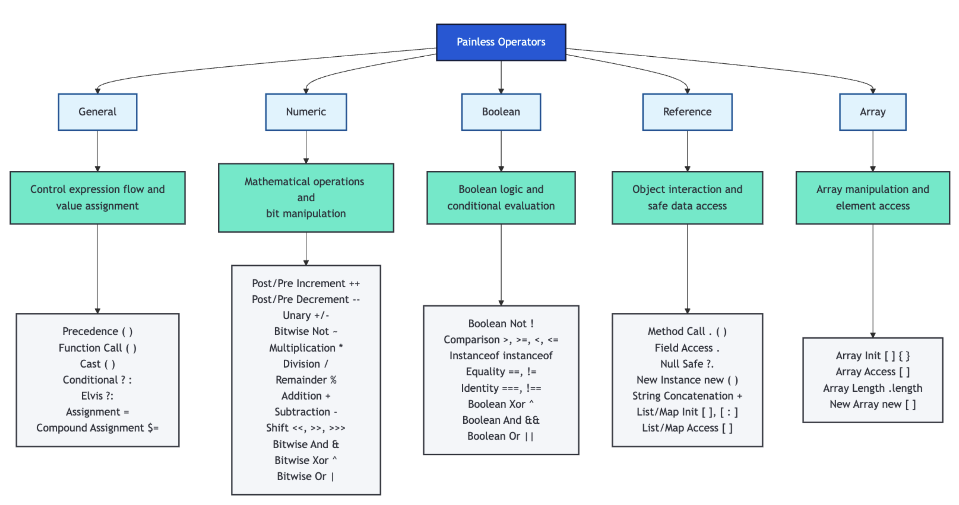 Painless operators use Java-like syntax with Elasticsearch specific enhancements such as null-safe navigation and specialized data structure access.