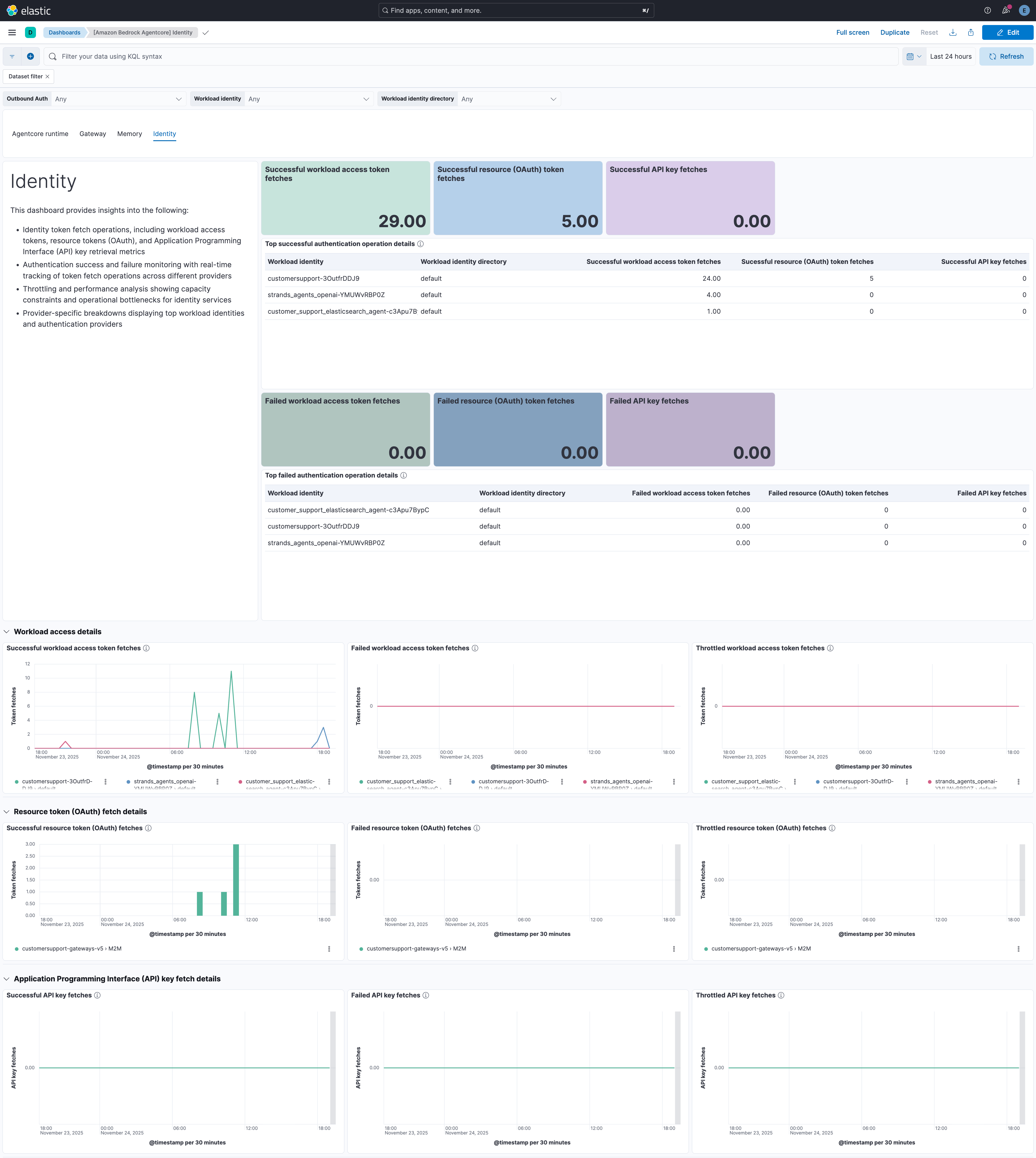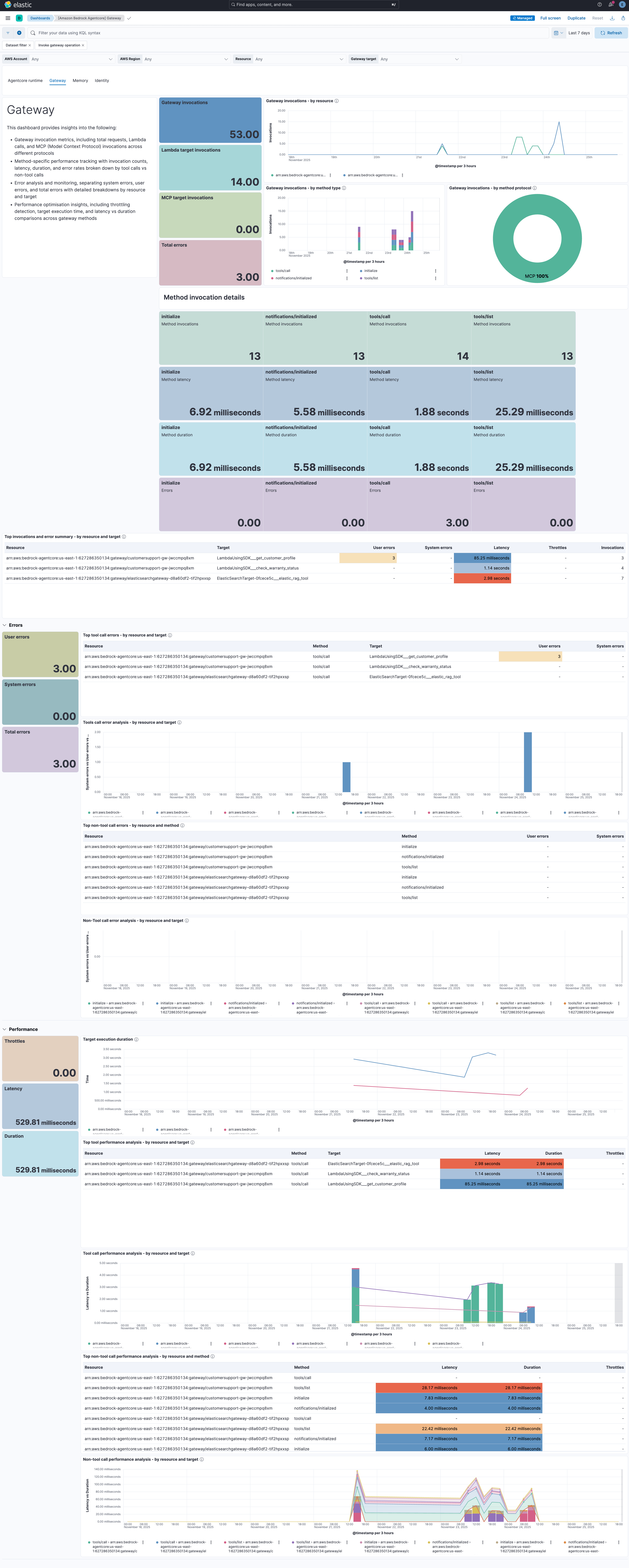 • metrics: Collects Amazon Bedrock AgentCore runtime metrics including invocations, sessions, latency, performance indicators, error rates, throttling metrics, token counts, target execution metrics, and authorization metrics from the following AgentCore components: Agent runtime, Gateways, Memory, and Identity.