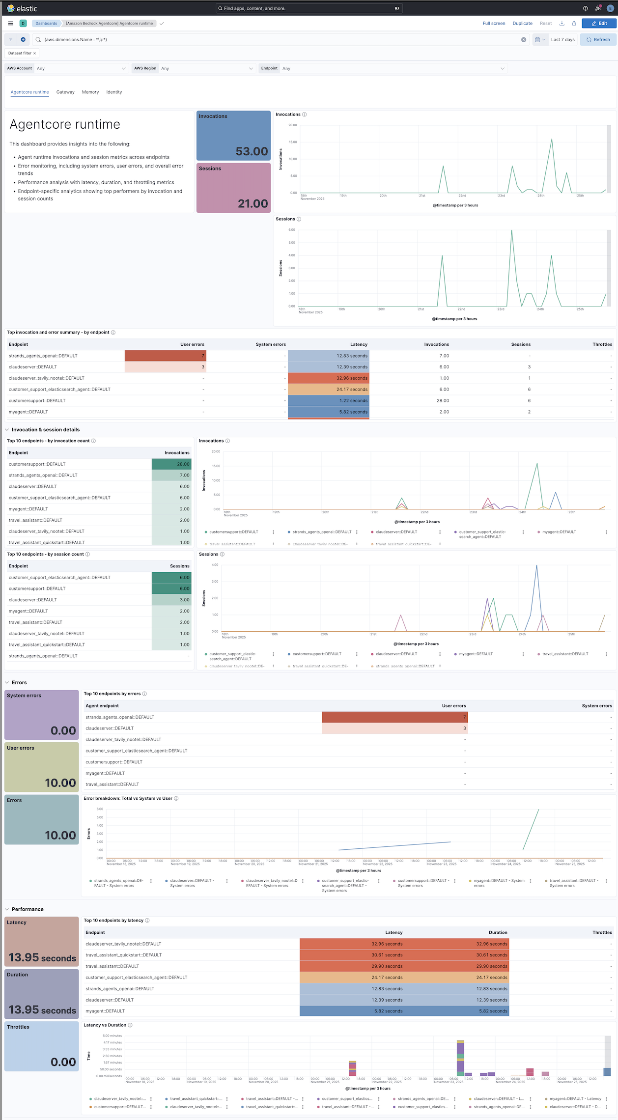 The Amazon Bedrock AgentCore integration enables seamless monitoring of your intelligent agents by collecting comprehensive runtime metrics and observability data. This integration provides visibility into agent execution activity, performance metrics, resource utilization, error rates, and operational insights essential for maintaining optimal agent performance.