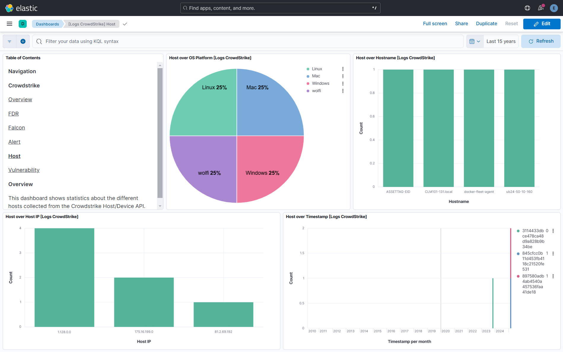 • vulnerability dataset: It retrieves all the vulnerabilities in your environment, providing information such as severity, status, confidence levels, remediation guidance, and affected hosts, as detected by the CrowdStrike Falcon platform, via the Falcon Spotlight Vulnerability API - /spotlight/combined/vulnerabilities/v1.