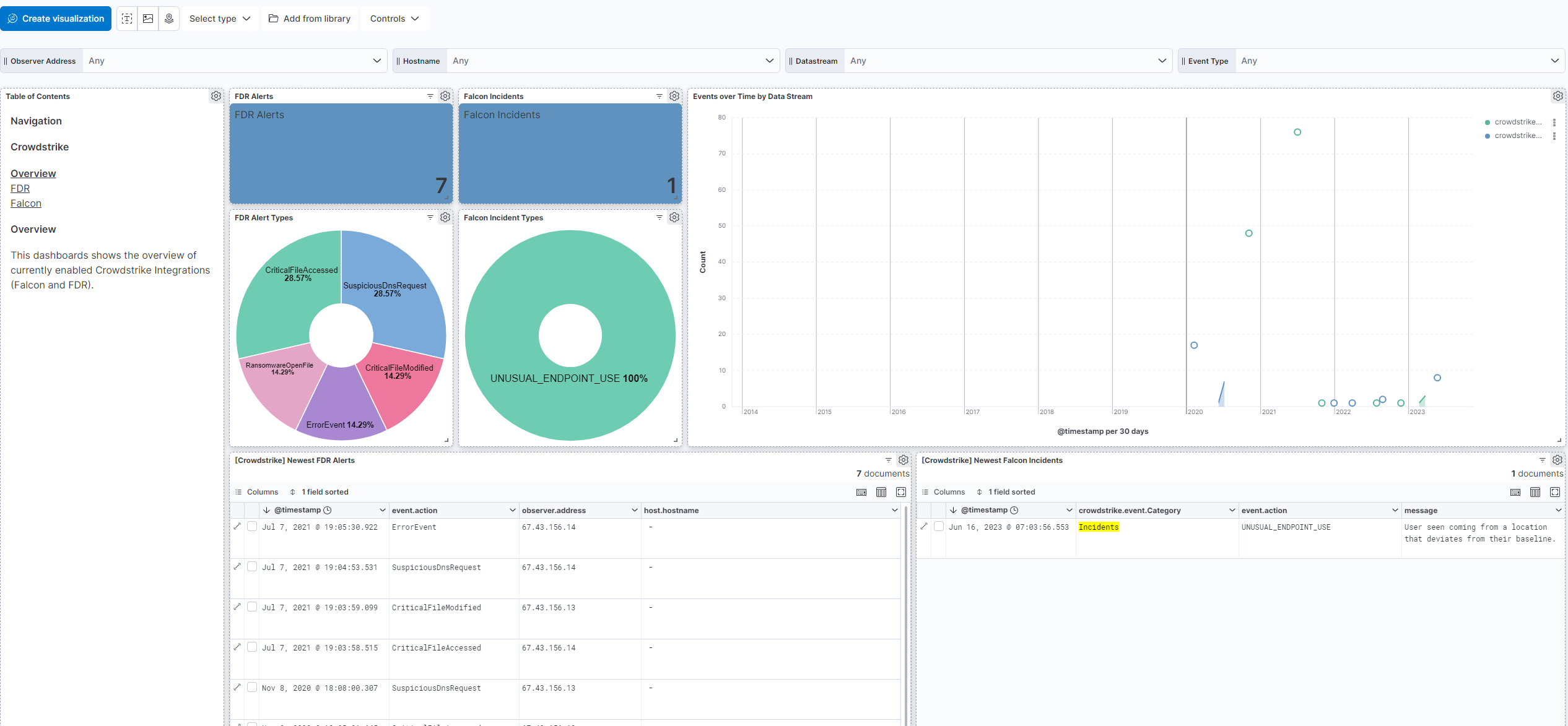 This integration includes one or more Kibana dashboards that visualizes the data collected by the integration. The screenshots below illustrate how the ingested data is displayed.
