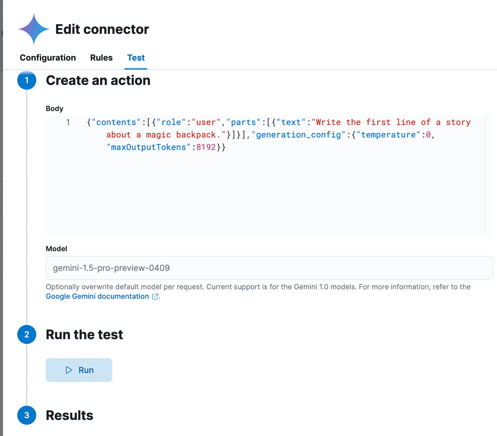 { body: JSON.stringify({ contents: [{ role: user, parts: [{ text: 'Hello world!' }] }], generation_config: { temperature: 0, maxOutputTokens: 8192 } }) } - Model