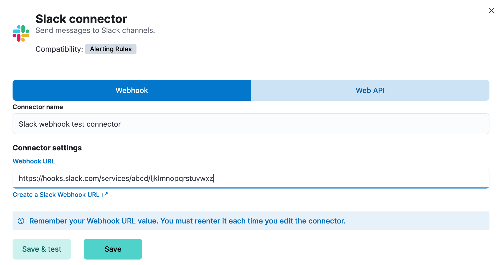 You can create connectors in Stack Management > Connectors or as needed when you're creating a rule. You can choose to use a webhook URL that's specific to a single channel. For example:
