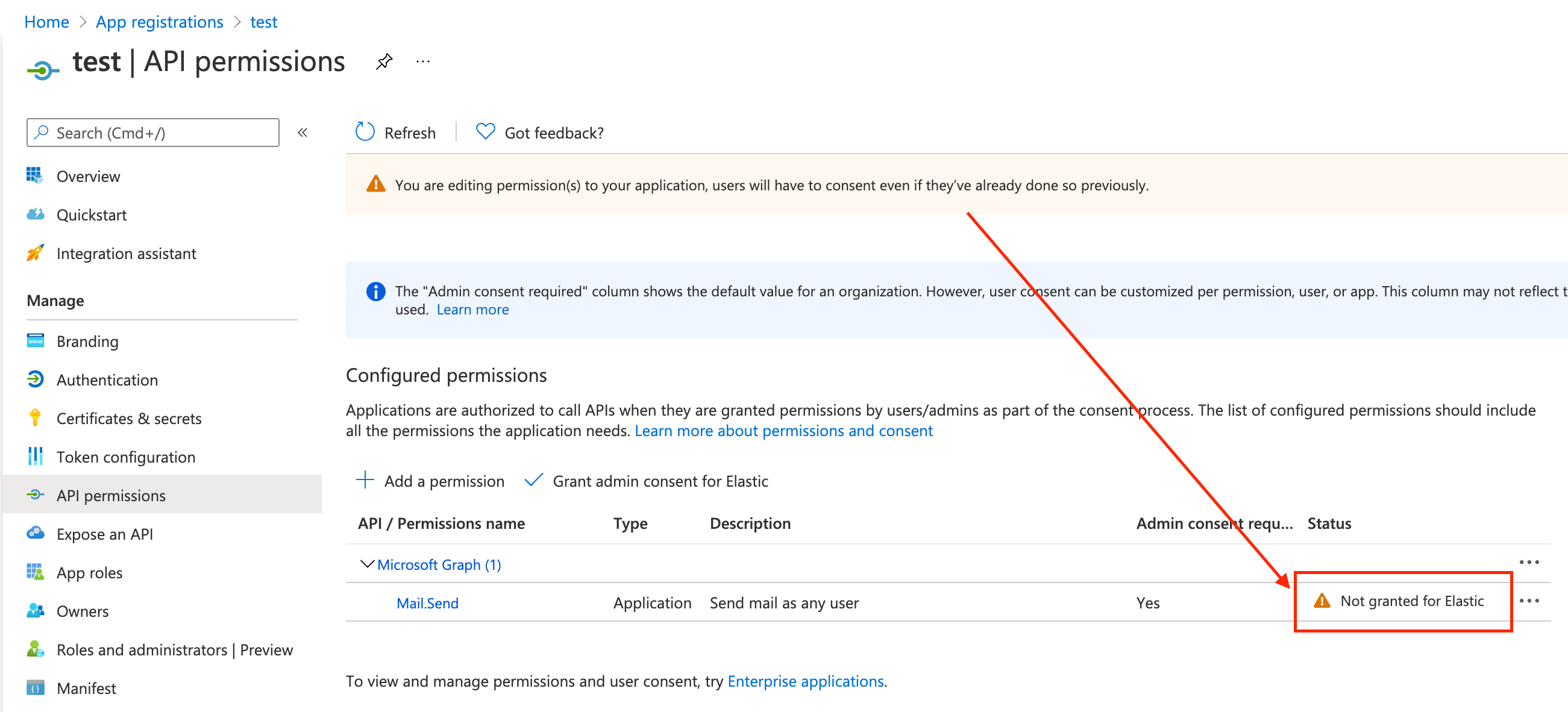 Confirm that the status for the "Mail.Send" permission is now granted.